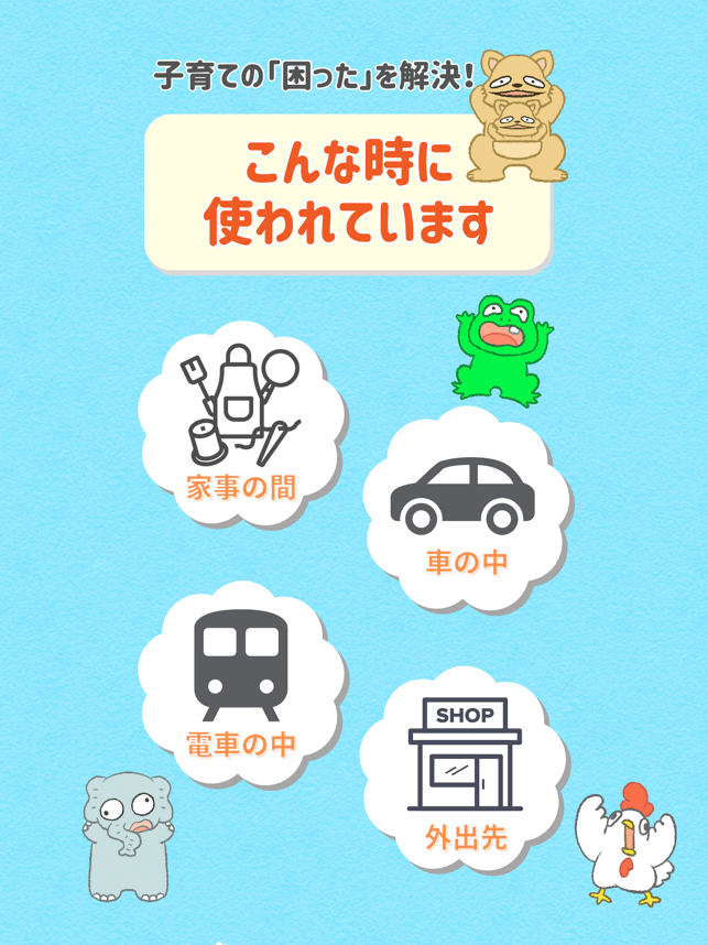 タッチ1つでたくさんのキャラクターたちがいないいないばあをしてくれる、みんなを笑顔にする泣き止みアプリです。