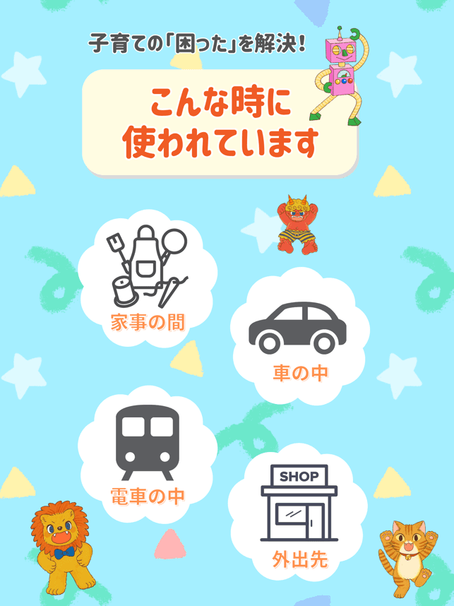 このアプリは特に小さいお子様が使いやすいように設計されています。複雑な操作は一切不要で、画面に表示されるびっくり箱をタッチするだけ。いつでもどこでも、お子様が自分で直感的に遊べるようになっています。また、キャラクターの表情を楽しむアプリの為、音を出せない環境でも使用することができます。多くの方にご利用いただいている「遊びと学び」が一体となったアプリです。