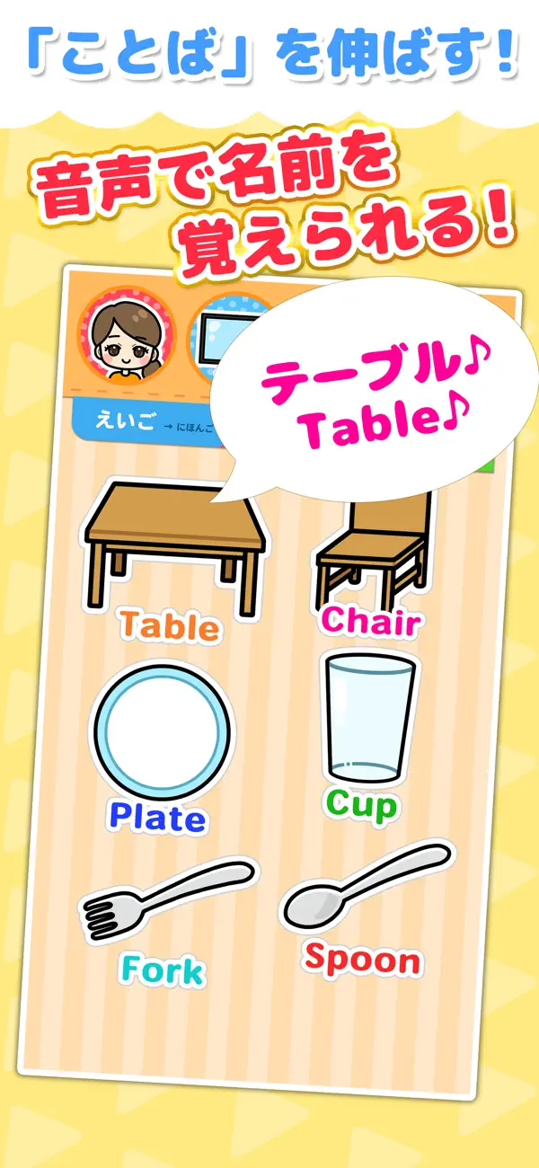 タッチするだけで英語の挨拶や生活のことばが楽しく覚えられるアプリ。