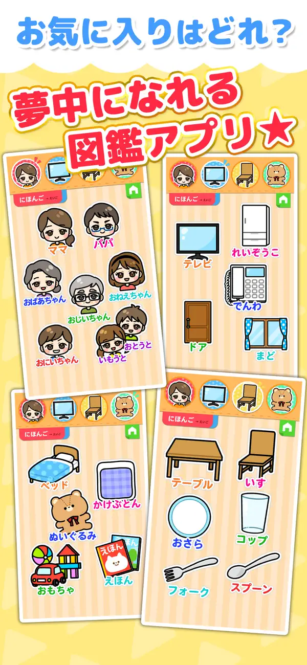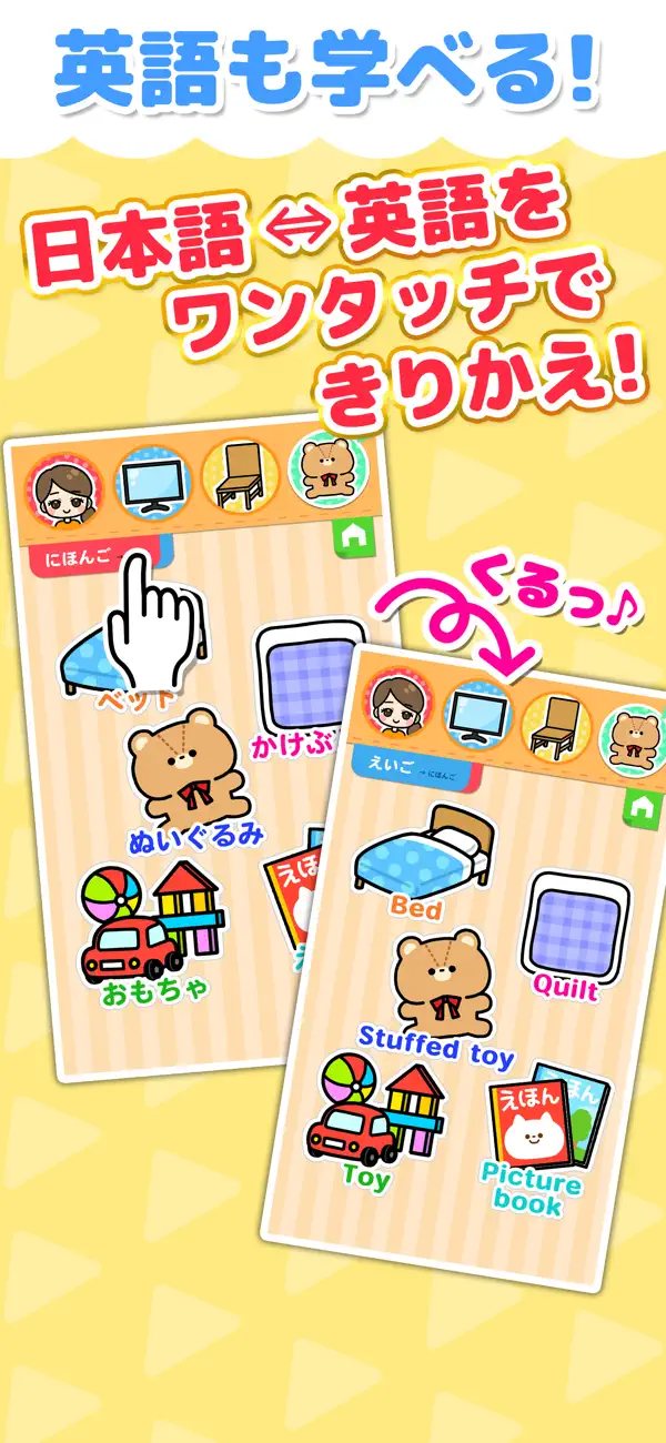 イラストをタッチすると音声が再生されます。日本語⇔英語の切り替え機能つき。