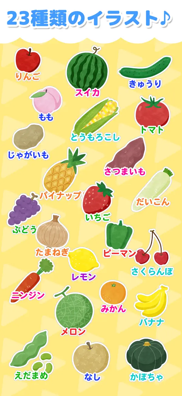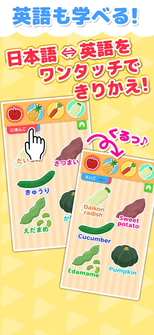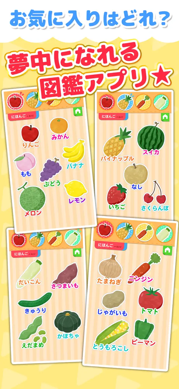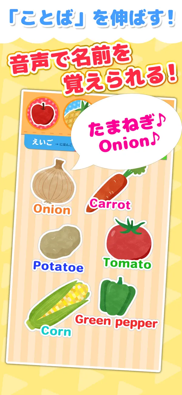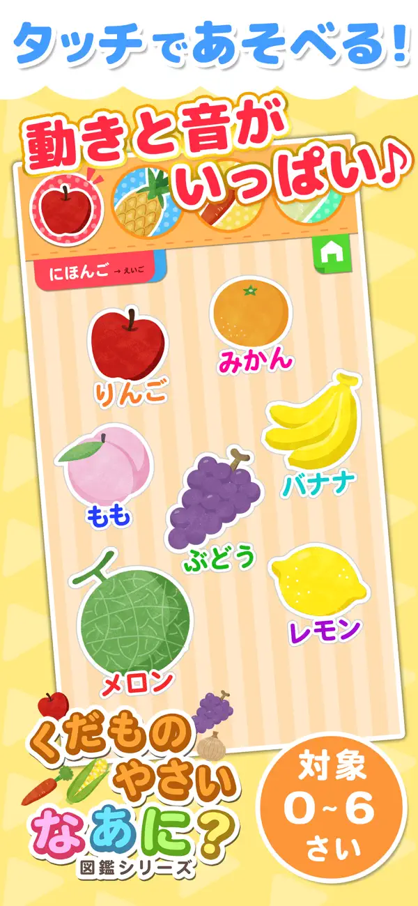 タッチするだけで野菜や果物の名前が楽しく覚えられる図鑑アプリ。