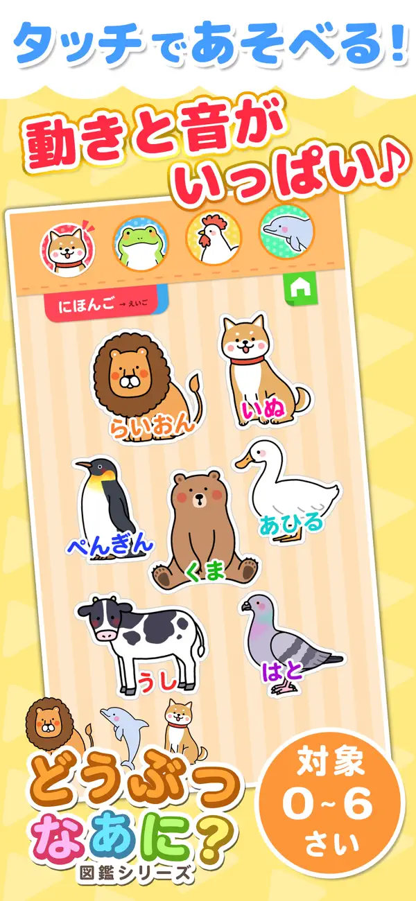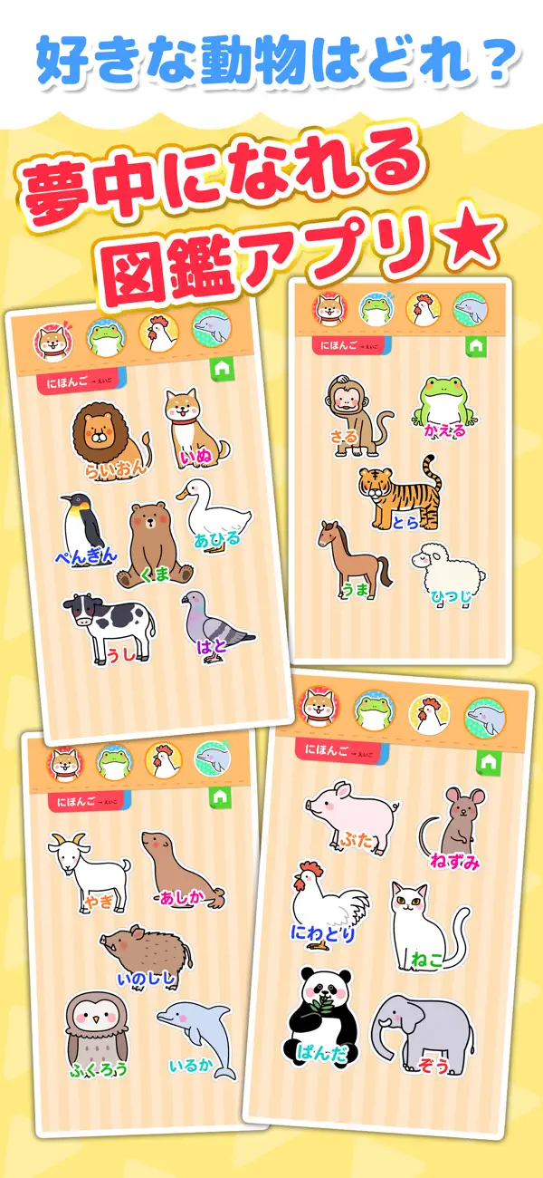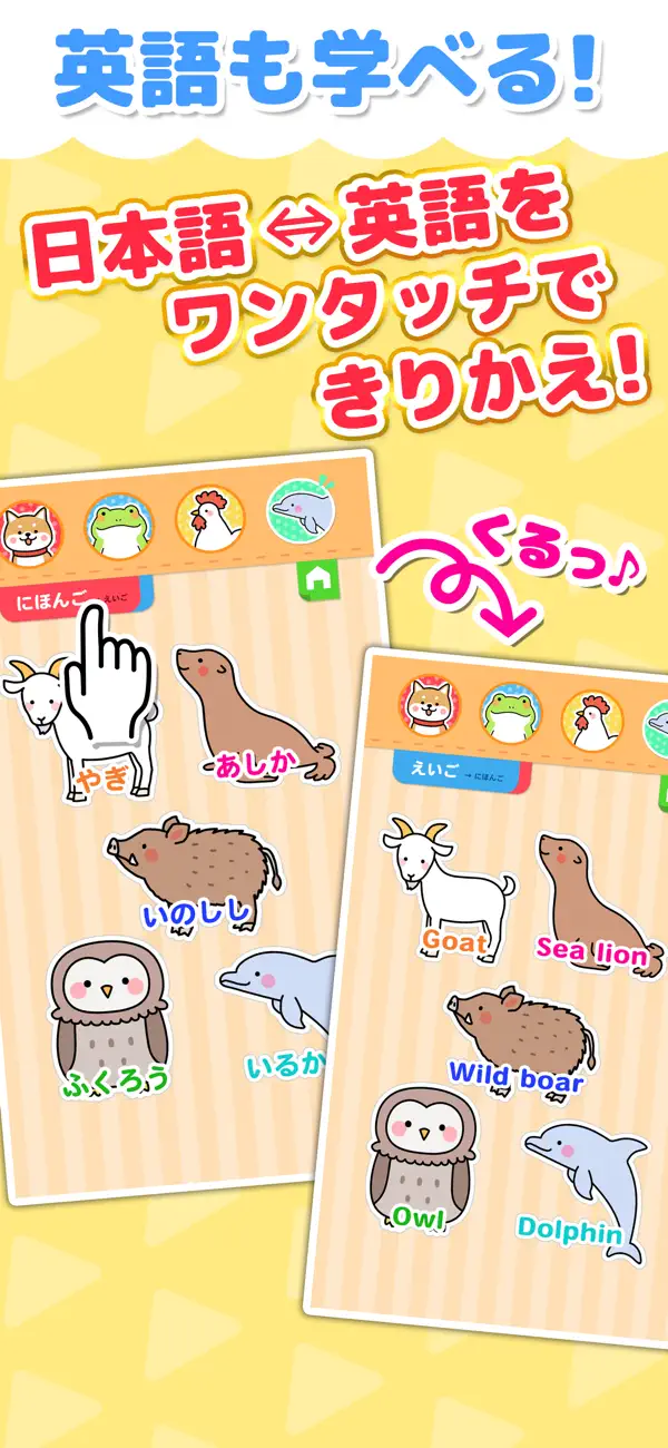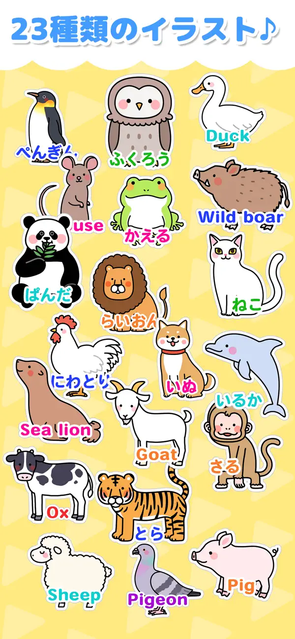 全23種類の動物イラストをタッチして、楽しく学びましょう!