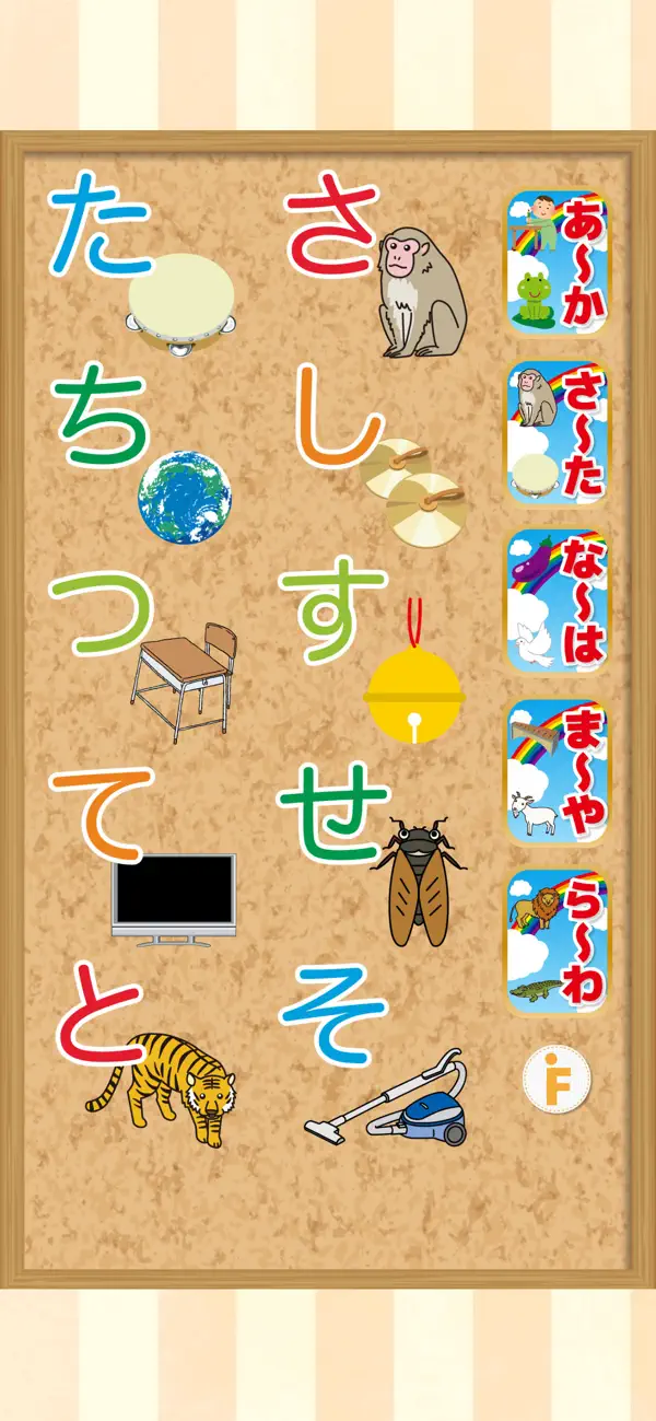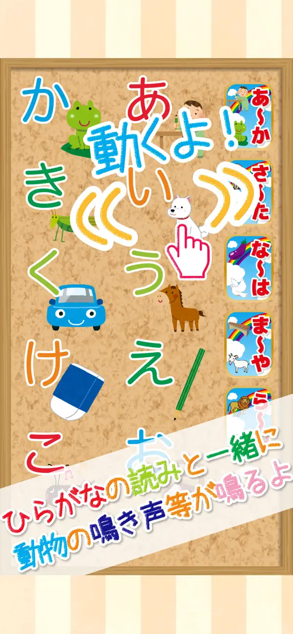 ひらがなをタッチすると、「あ あかちゃん」や「い いぬ」と再生され、音や動きを楽しみながらひらがなを覚えられる知育アプリです。